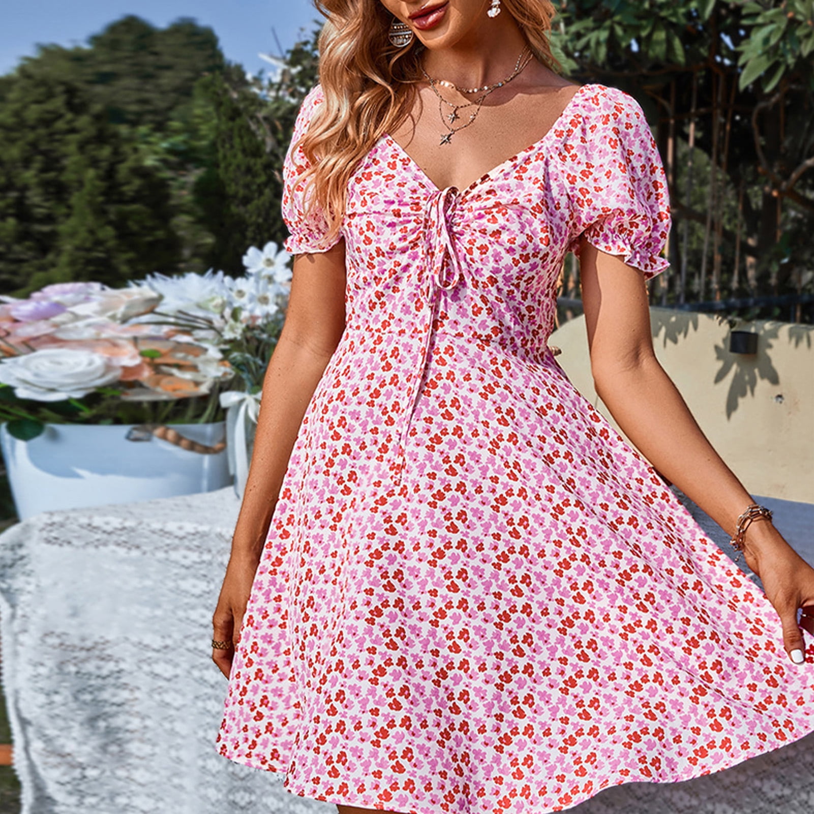 Khall Women V Neck Dress Puff Sleeve Ruched Strap Elastic High Waist Floral Short Dress For Summer Floral Short Dress Walmart Com